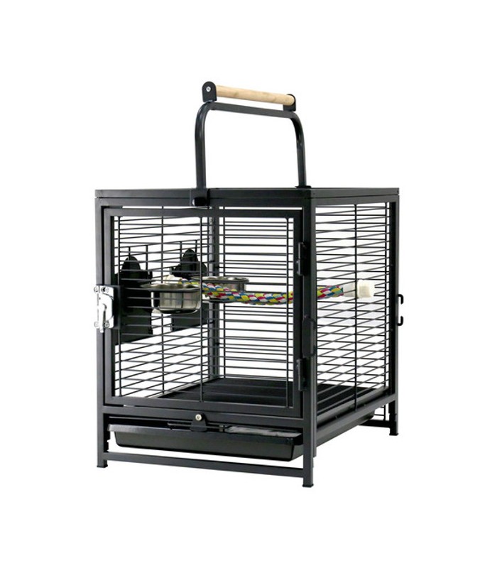 Deze transport kooi is ideaal om grote parkieten of papegaaien in te vervoeren. Het handvat kan ook gebruikt worden als zitstok, Er zitten uitsparing in de tralies zodat de kooi vast gezet kan worden in de autogordel.