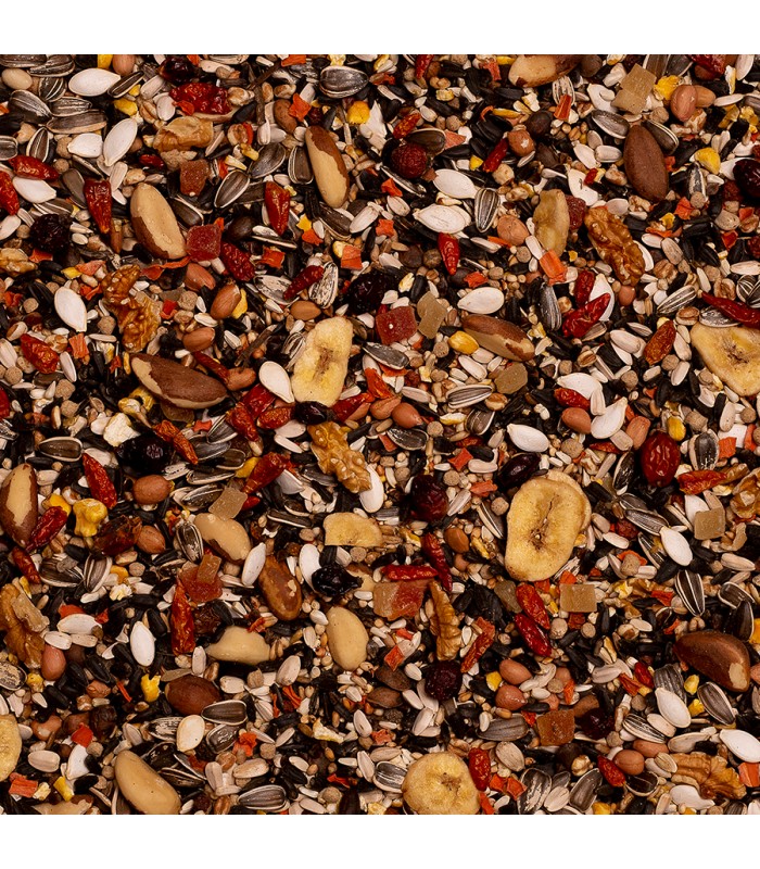 zwarte zonnebloempitten, grote gestreepte zonnebloempitten, witte zonnebloempitten, cardy, sorgho wit, boekweit, gepofte maïs, pompoenzaad, cedernoten, paranoten, tarwe, gepofte tarwe, ge-extrudeerde pellets, gepelde pinda’s, grit, rozenbottel vrucht, paddy rijst, gepelde haver, wortelstukjes, walnoten, mariëndistel, lijsterbessen, bananen stukjes, ananas, papaya, chilipepers