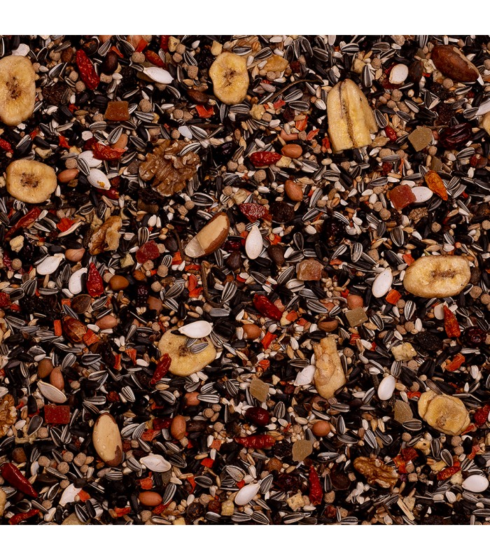 zwarte zonnebloempitten, gestreepte zonnebloempitten, cardy, boekweit, sorgho wit, geëxtrudeerde pellets, paddyrijst, tarwe, cedernoten, gepelde haver, grit, jeneverbessen, gerst, rozijnen, kempzaad, rozenbottelvrucht, wortelstukjes, gepelde pinda’s, pompoenzaad, mariëndistel, paranoten, papaya, ananas, bananenschijfjes, walnoten, lijsterbessen, chilipepers